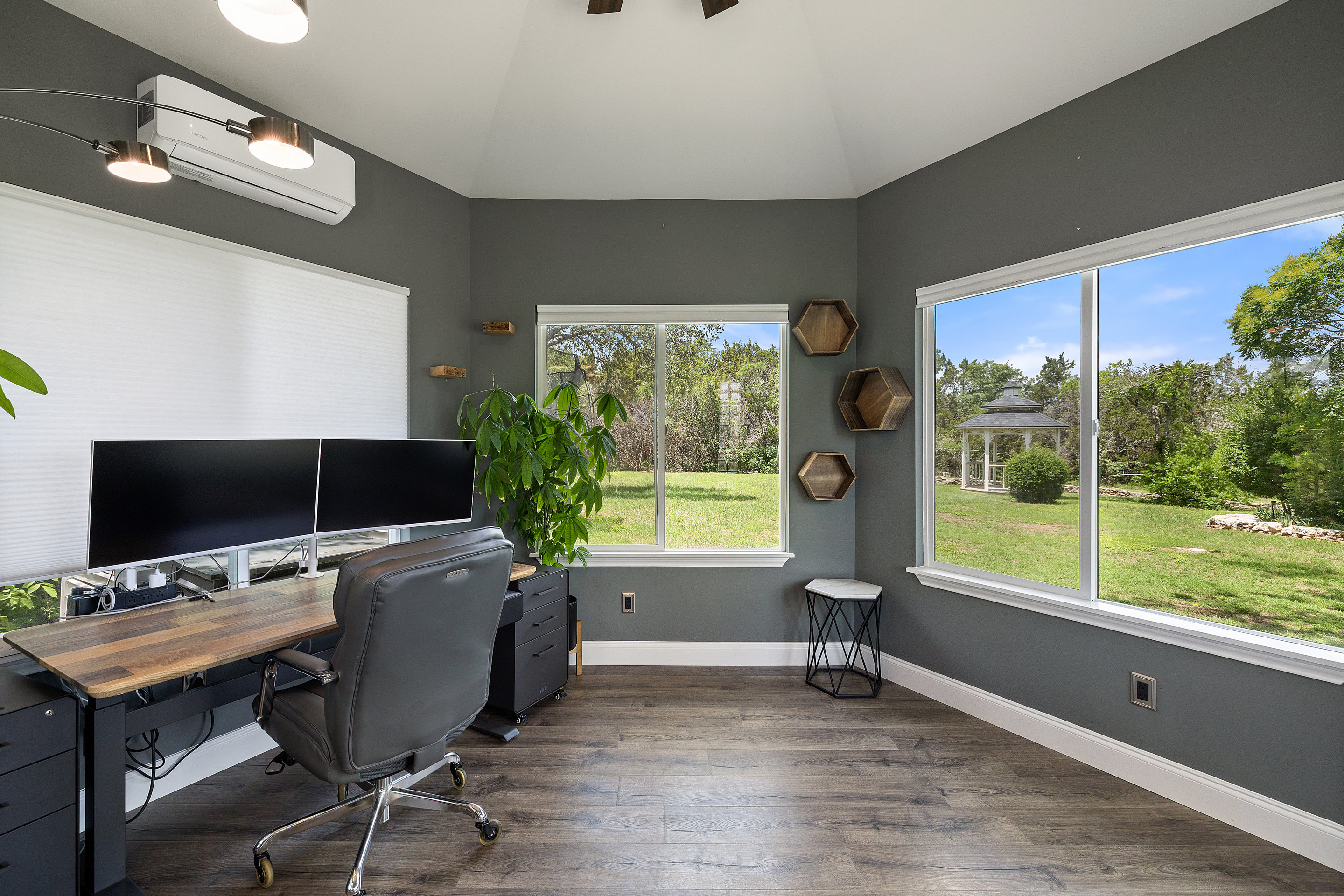 Nestled on a scenic ridge in Leander, this stunning 4-acre Hill Country estate offers sweeping panoramic views and luxurious indoor-outdoor living. Surrounded by mature oaks and native landscaping, the elegant brick and stucco home feels like a private retreat, just minutes from Lake Travis, top-rated schools, and the amenities of Cedar Park and Northwest Austin. Nature lovers will appreciate the nearby Brushy Creek Regional Trail and the Louis René Barrera Indiangrass Wildlife Sanctuary. Inside, natural light floods the open-concept layout through expansive windows that frame breathtaking vistas.